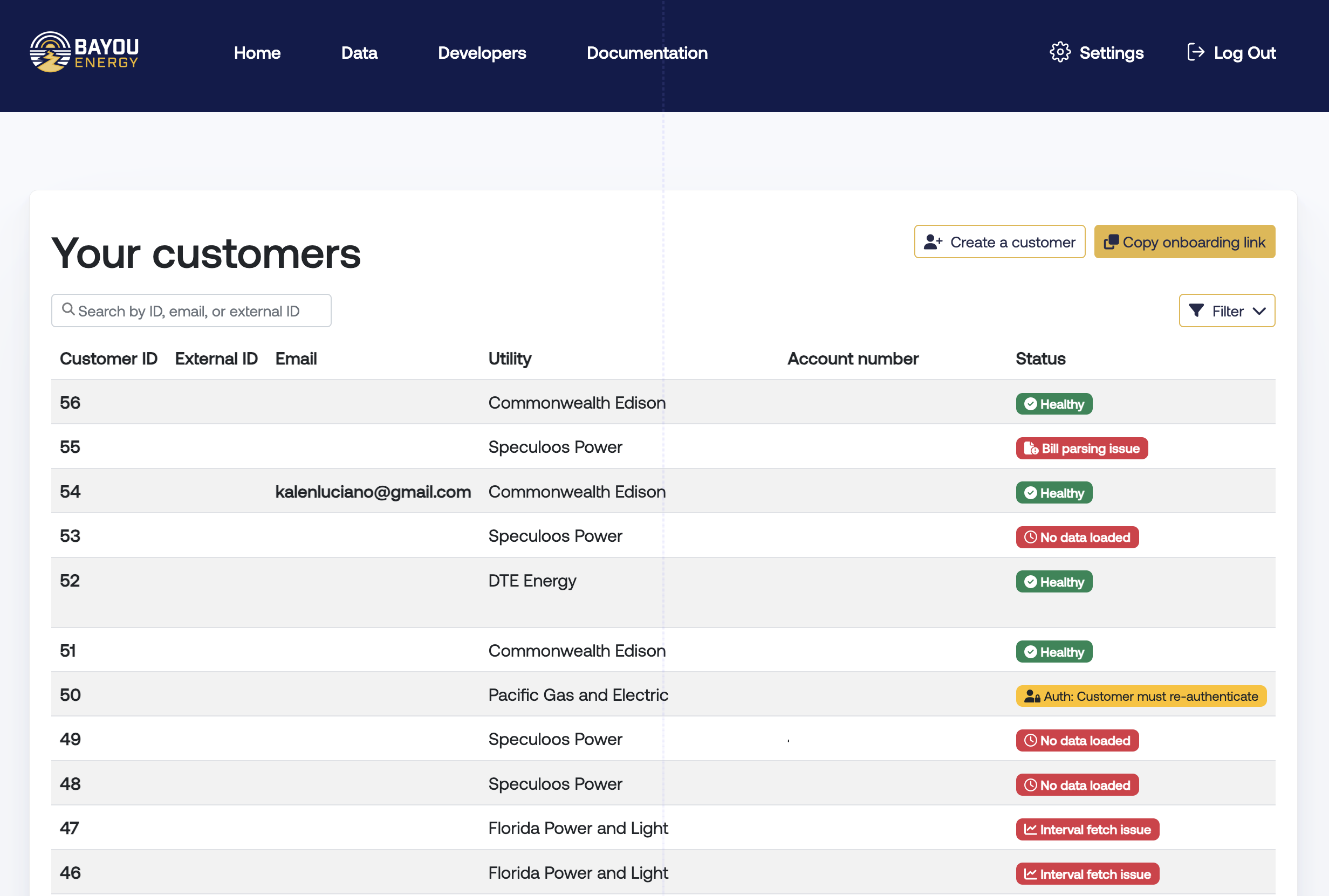 | No data loaded | Bayou encountered an issue attempting to fetch this customer's data from the customer's utility portal. | No action required. Bayou is investigating. If urgent, reach out to [email protected] |