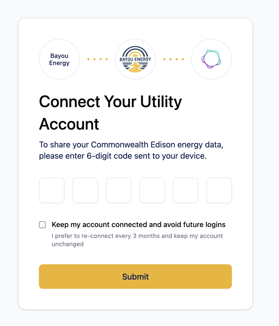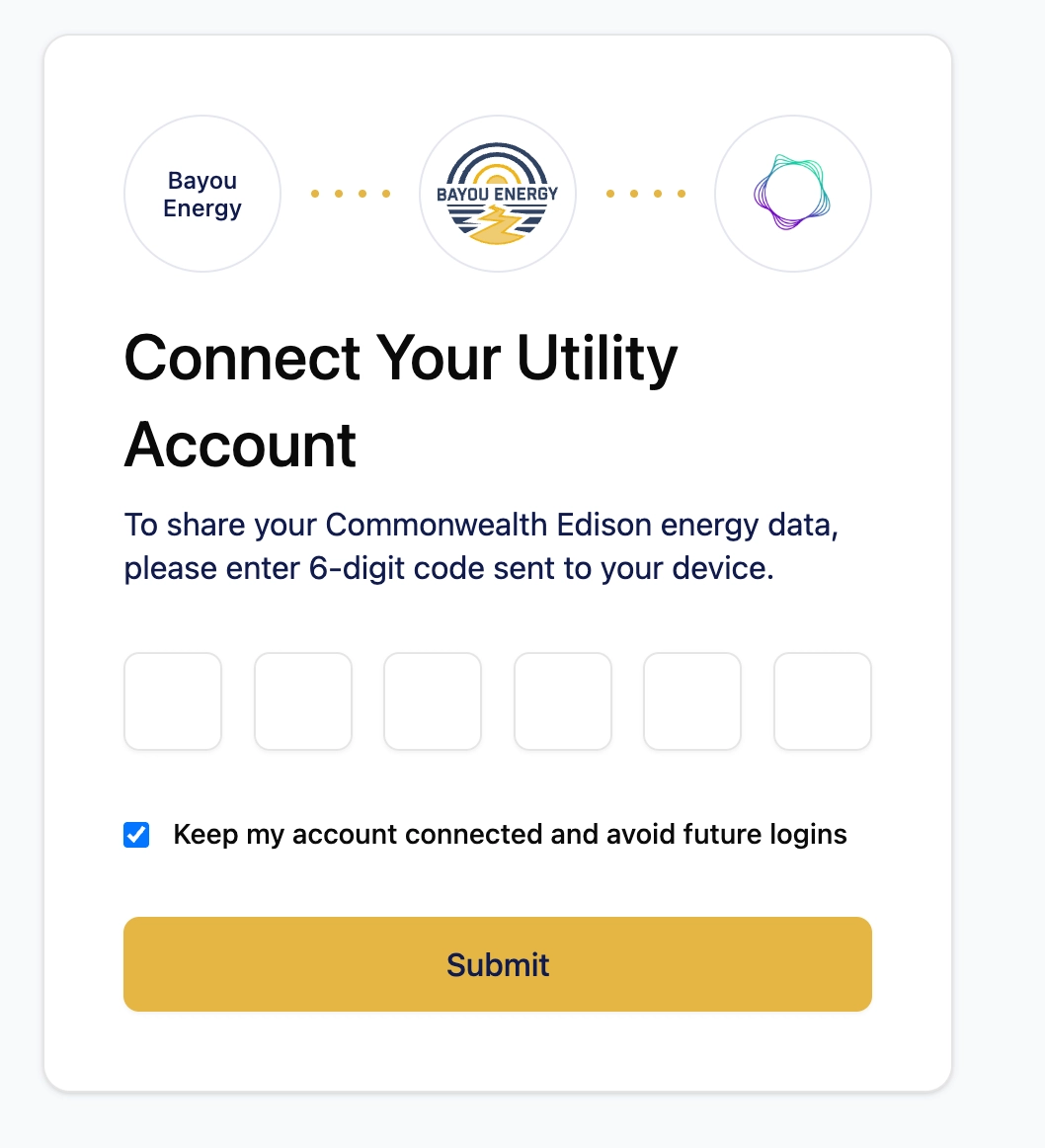 Bayou enables customers to securely grant access to their utility data to companies who need that data. For most scenarios, companies get access to data indefinitely, as Bayou refreshes the data in the background on an ongoing basis. However, multi-factor authentication can disrupt this process. Using Bayou’s current publicly available feature set, companies get data for customers with multi-factor authentication for 3-6 months, after which point the customer needs to re-authenticate. Many customers don't, which can affect everything from enrollment verification to load forecasting to settlement.