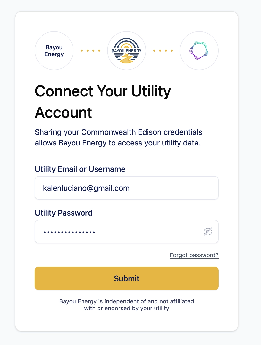 The utility account is now linked and Bayou will be able to retrieve utility data indefinitely.