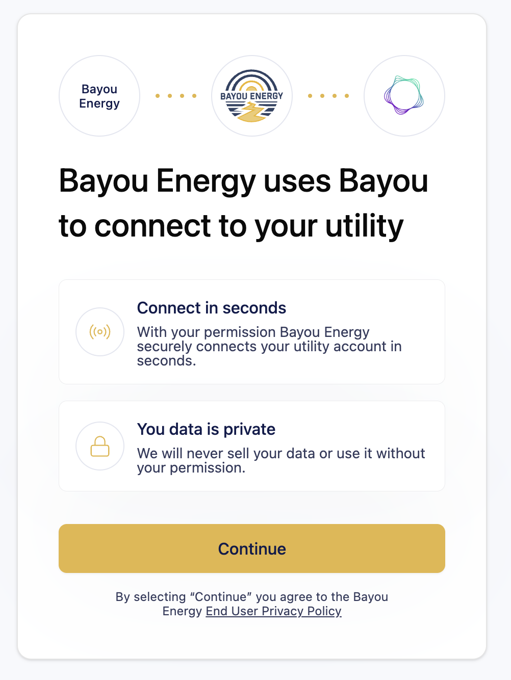 The customer is presented with a brief overview of what Bayou does and how their data is handled. The customer clicks Continue to proceed.